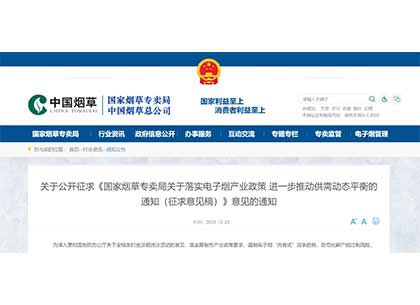 国家烟草专卖局关于落实电子烟产业政策 进一步推动供需动态平衡的通知(征求意见稿)2025-12-26国家烟草专卖局关于落实电子烟产业政策 进一步推动供需动态平衡的通知(征求意见稿) -